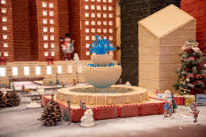 Experience the holiday charm with the decorated holiday tree in the Great Hall and Grand Gingerbread Hotel and Chicago cityscape.